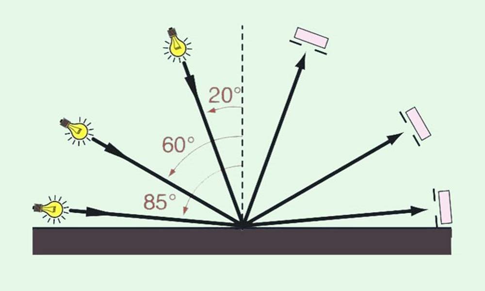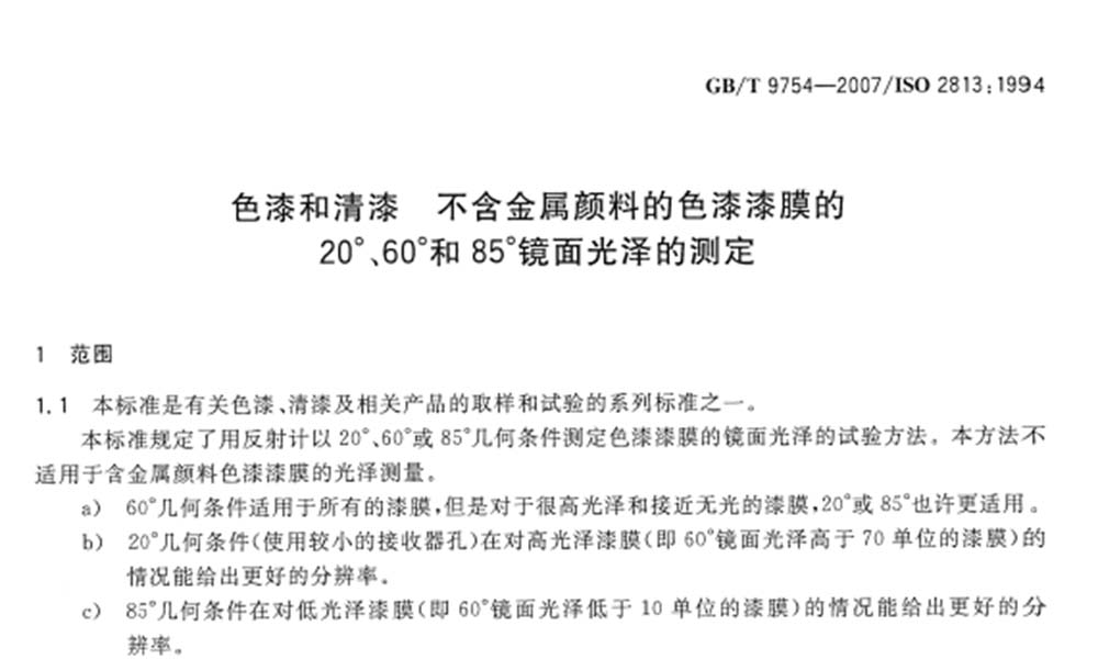 在國家標(biāo)準(zhǔn)GB/T9754-2007中,對于色漆、清漆、不含金屬顏料的色漆漆膜等的光澤度提出了明確的判定方法,以20°、60°或85°幾何條件來測定。20°、60°、85°三個測量角度是指與被測物表面垂直的法線與入射光束的夾角。60°適用于所有漆膜,20°更適合高光澤漆膜,即60°鏡面光澤度高于70單位的漆膜,85°適用于低光澤漆膜,即60°鏡面光澤低于10單位的漆膜。一般而言,可用60°的通用角度測量油漆。